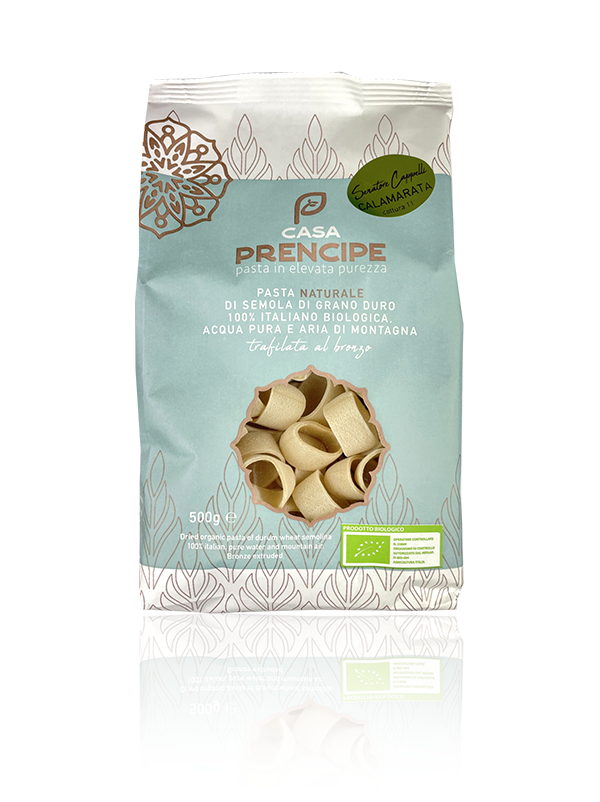In Bronze gezogene Calamarata aus ausgewähltem Hartweizen der Sorte Senatore Cappelli. Hergestellt in Apulien.