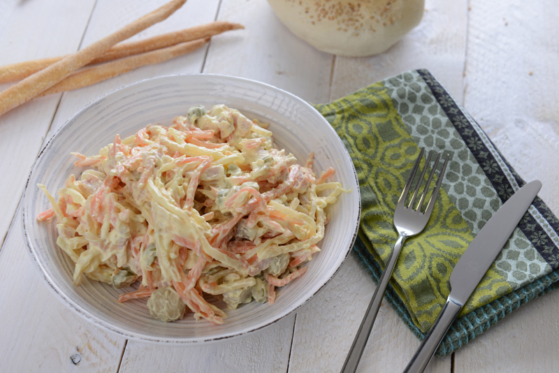 Gastronomic preparation of carrots, celeriac, ham, mushrooms, green olives, mustard,